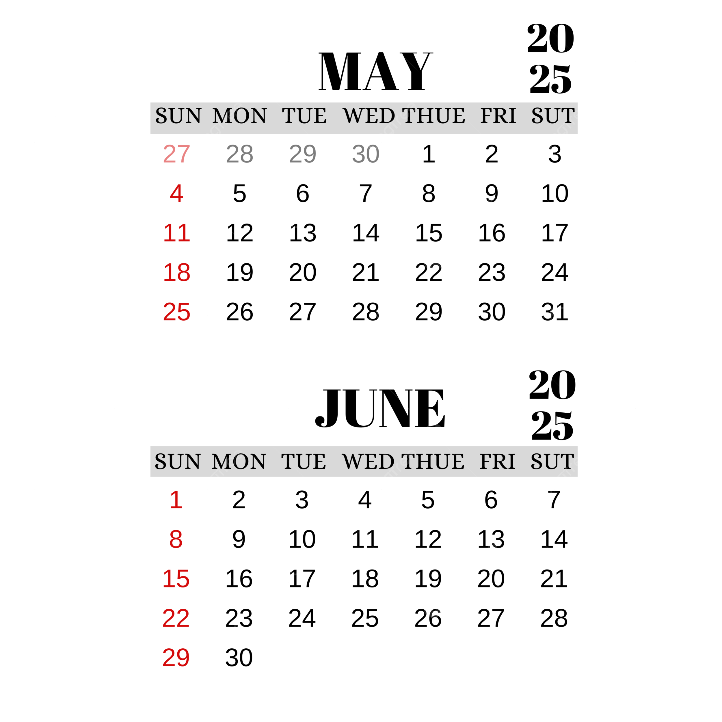 May And June 2025 Calendar Printable PDF Two Months Calendar