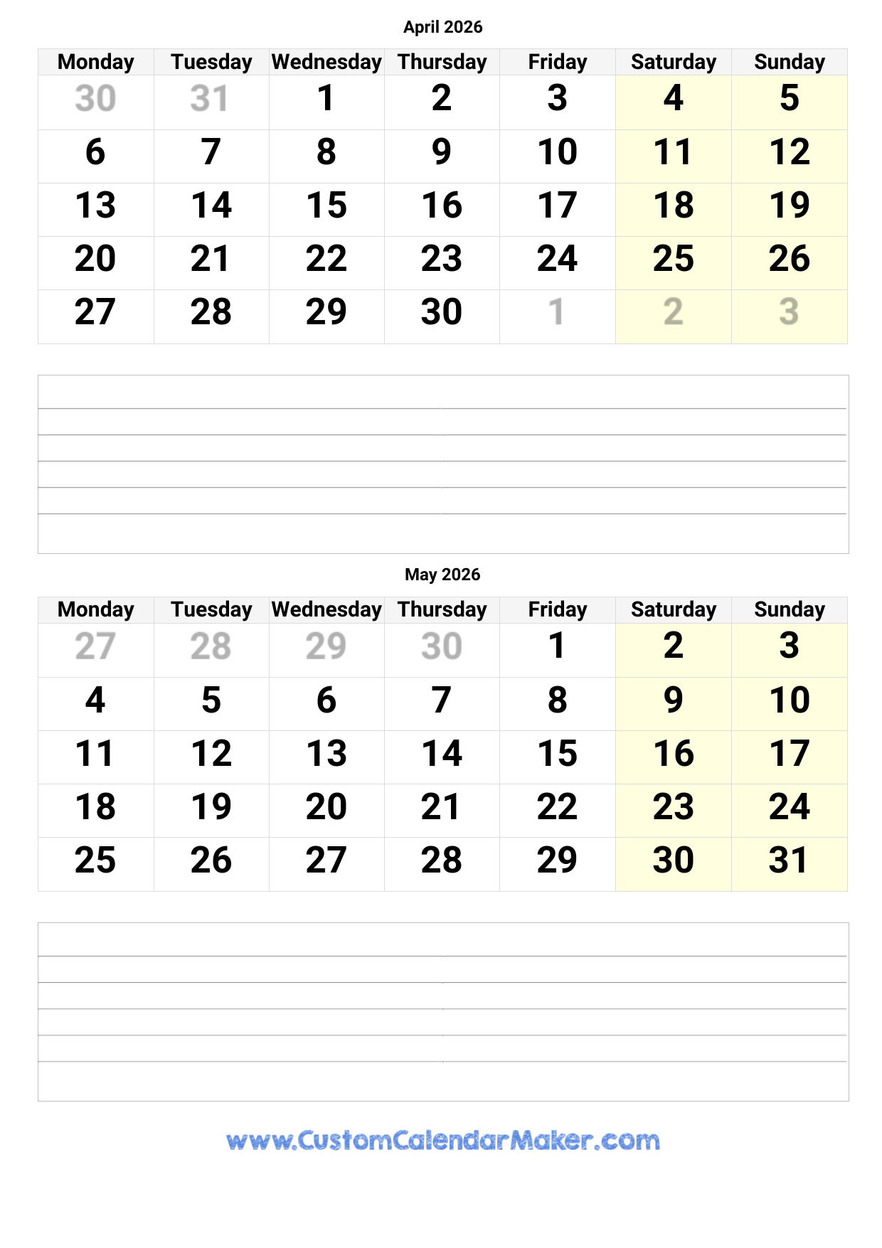 April And May 2026 Calendar Printable PDF Two Months Calendar