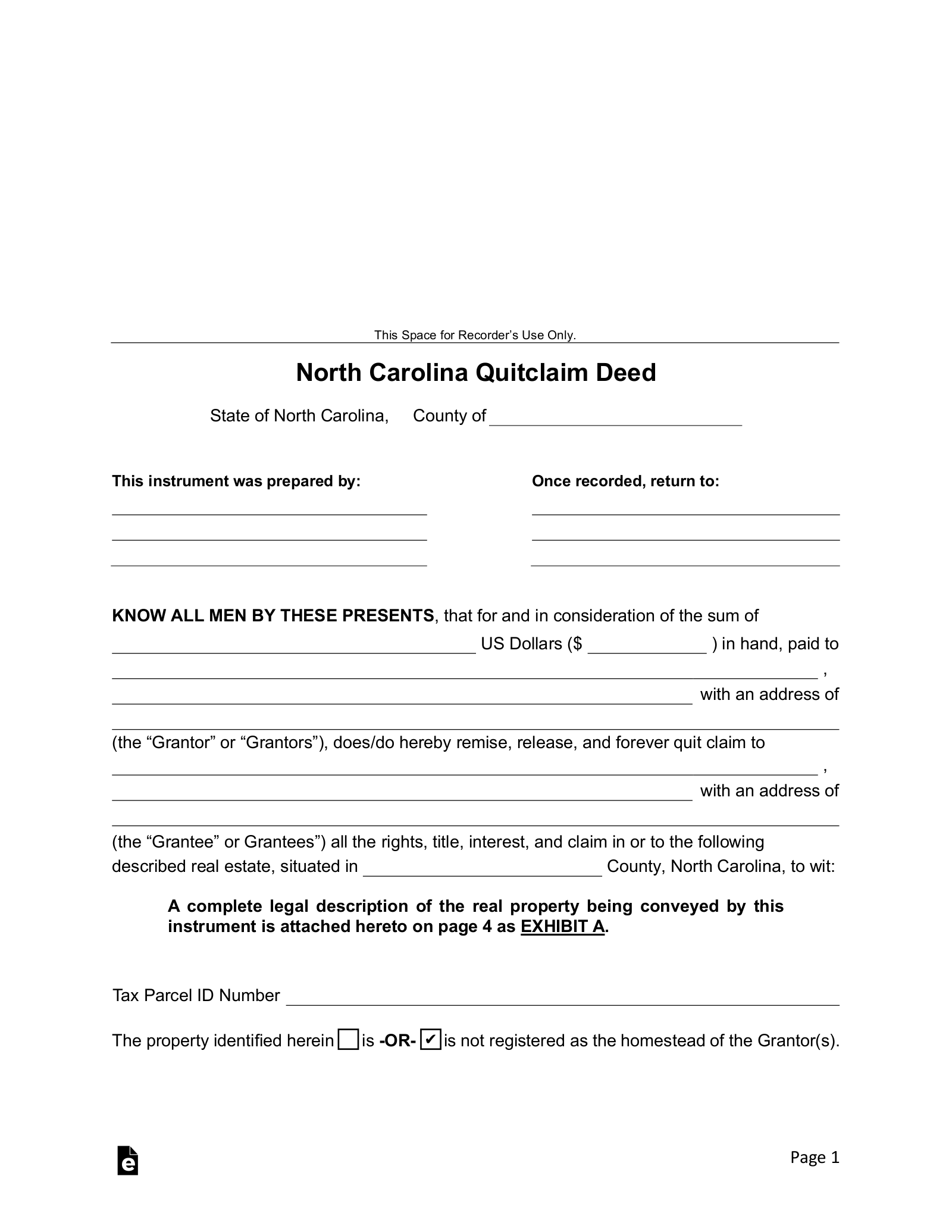 Free North Carolina Quit Claim Deed Form PDF Word EForms