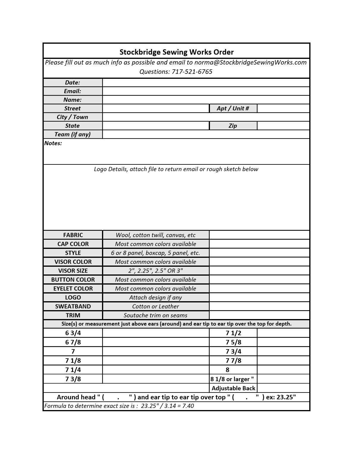 FREE TO PRINT Order Form For Custom Designed Caps Please Read Instruction Below