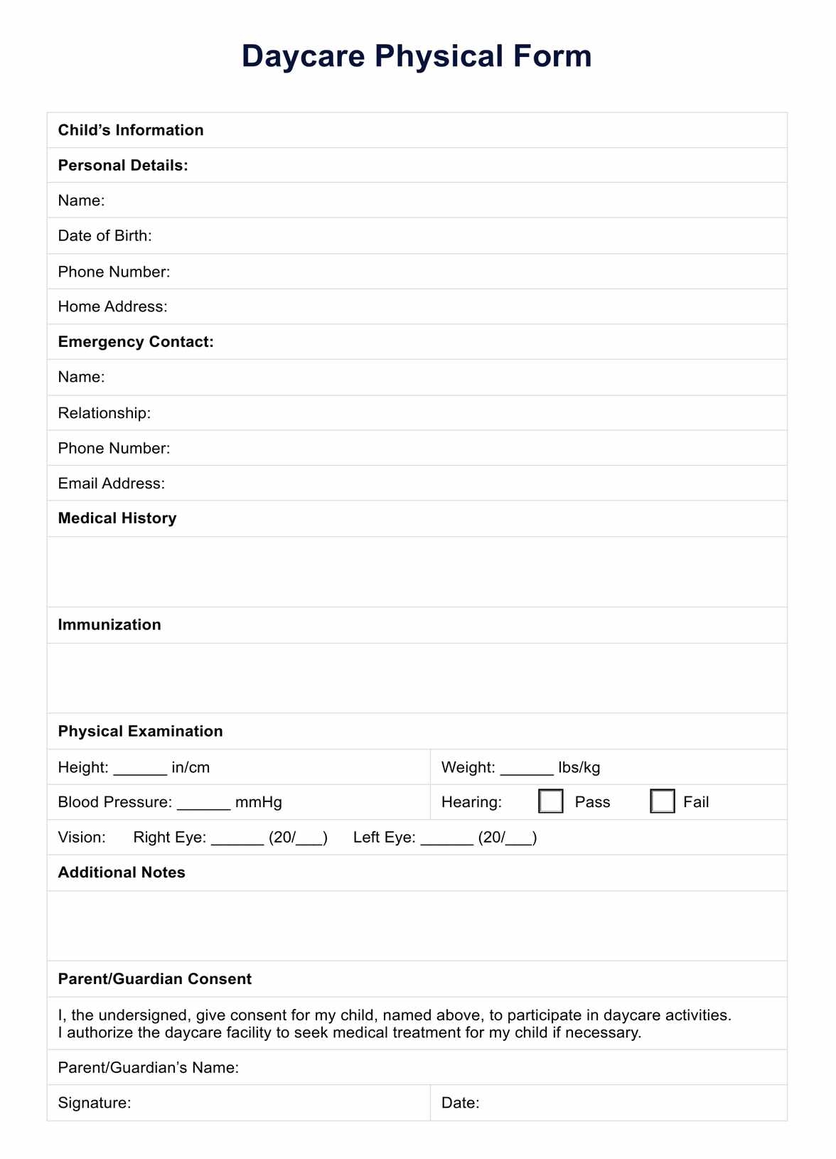 Daycare Physical Form U0026 Example Free PDF Download