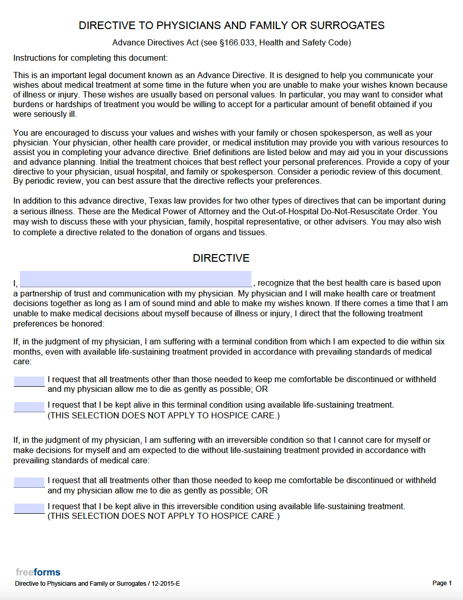 Free Texas Living Will Form PDF