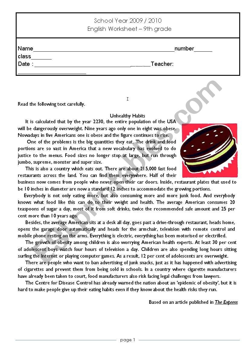 Teenagers And Diet Reading Comprehension ESL Worksheet By Bolisz