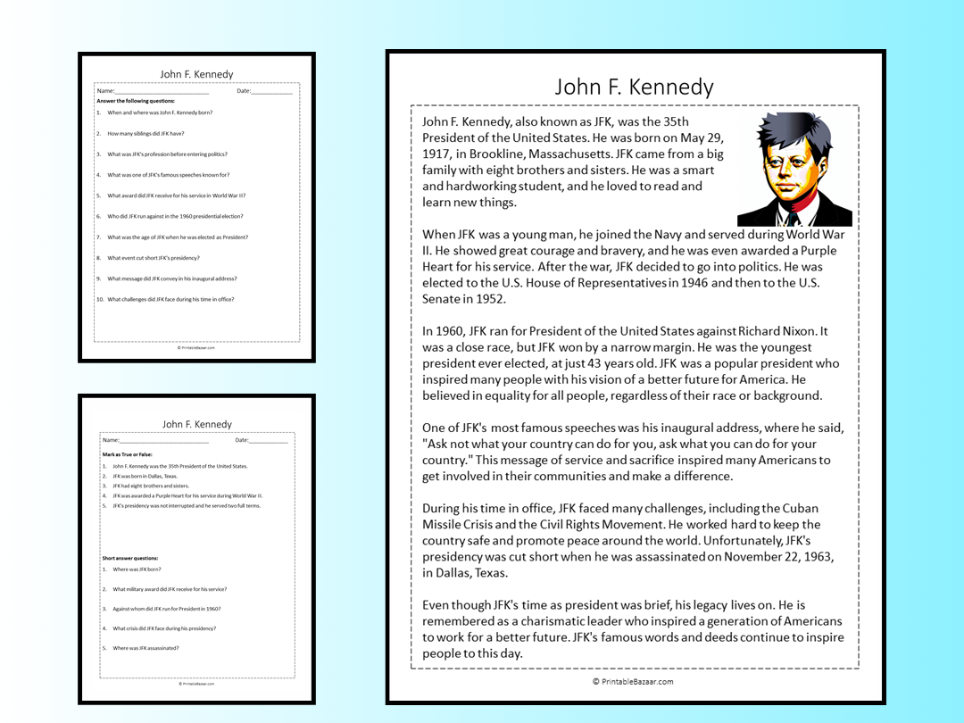 By using John F Kennedy reading comprehension worksheets, educators can help students improve their reading skills, critical thinking abilities, and historical knowledge. These worksheets also promote literacy and foster an appreciation for history and the impact of influential leaders like JFK.