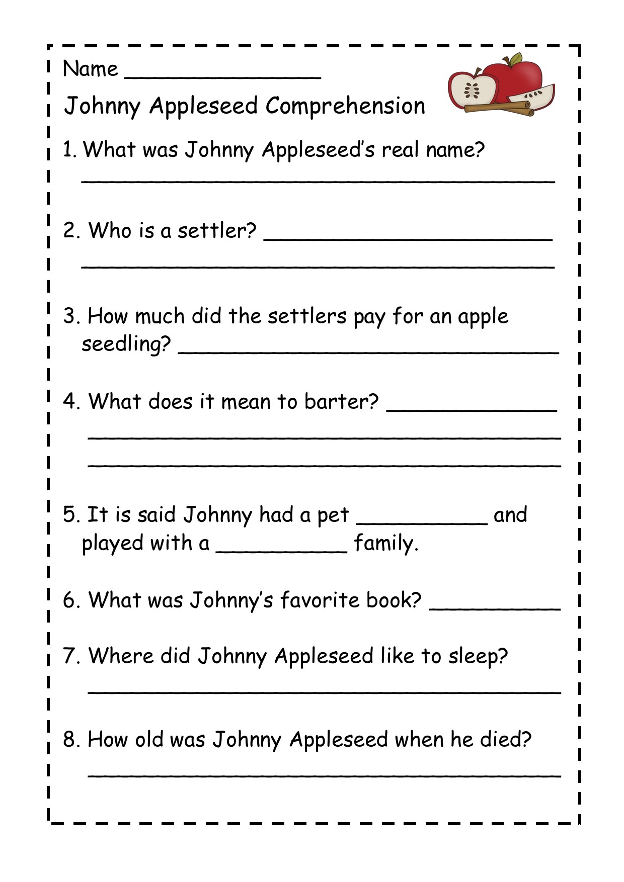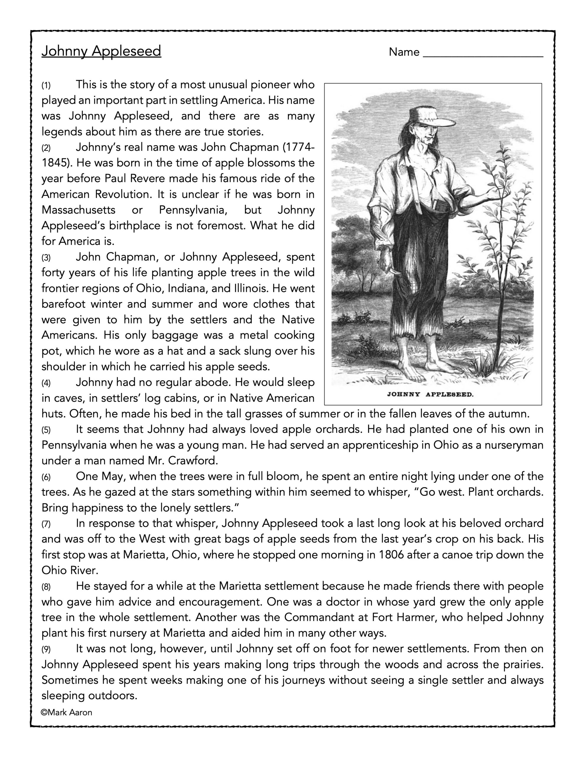 Johnny Appleseed Reading Comprehension Worksheets