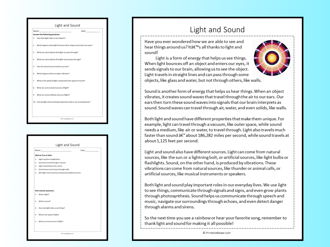 Light And Sound Reading Comprehension Passage Printable Worksheet Teaching Resources