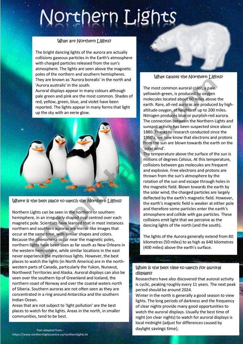 Northern Lights Reading Comprehension Part 2 ESL Worksheet By Cariboo