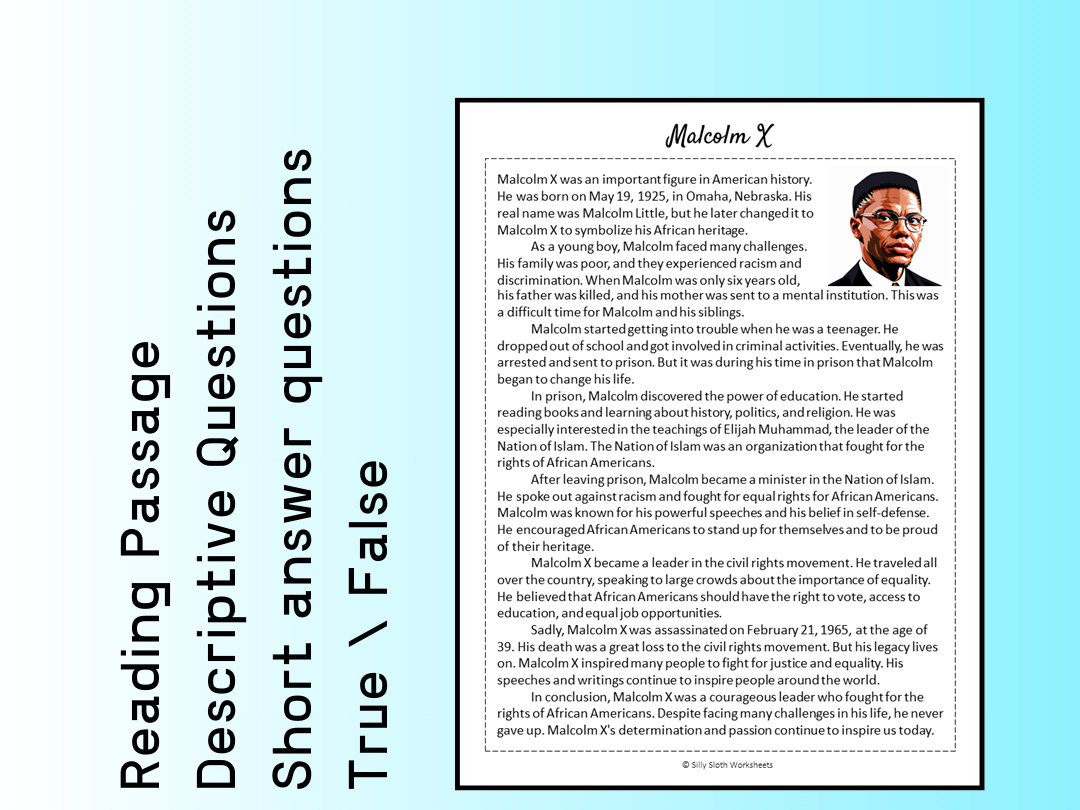 Malcolm X Biography Reading Comprehension Passage Printable Worksheet PDF Teaching Resources