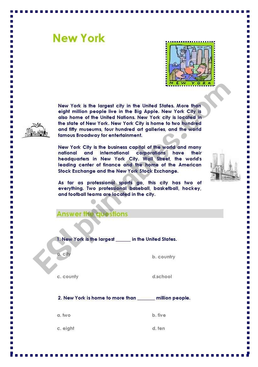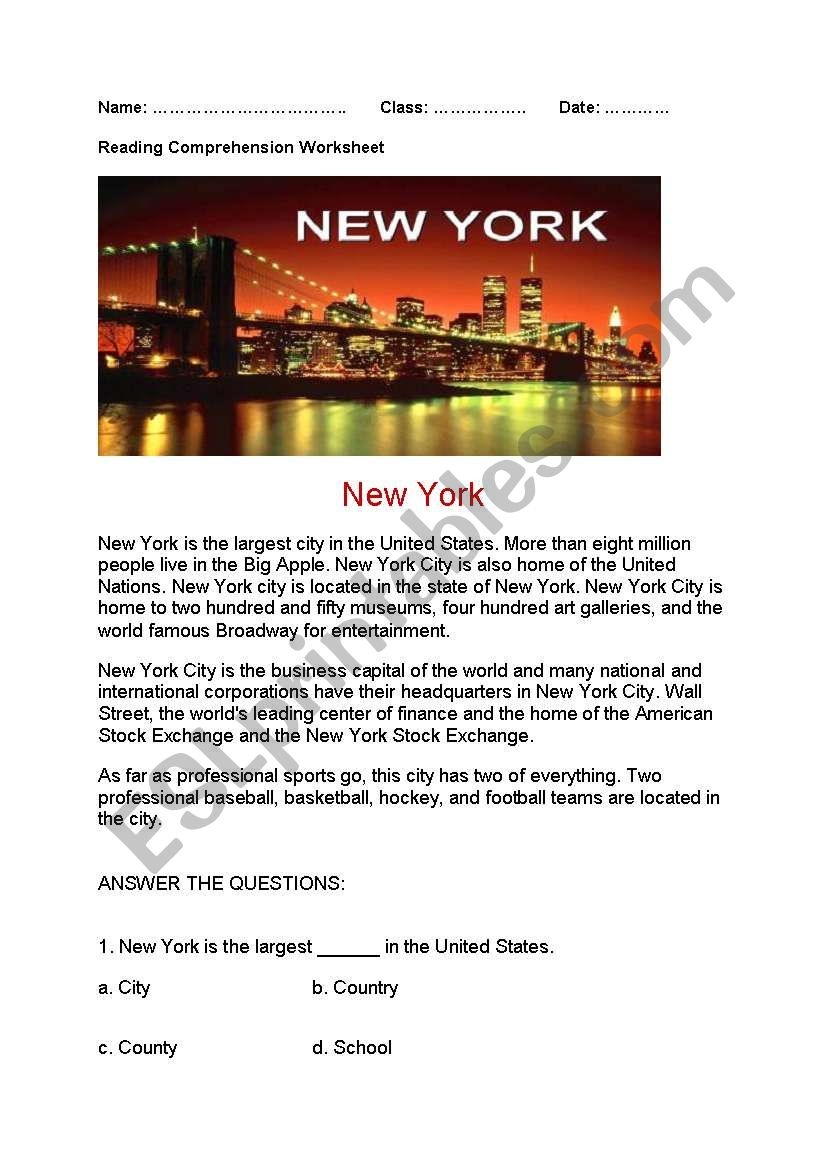 Reading Comprehension NEW YORK ESL Worksheet By SUPERBUBBLE