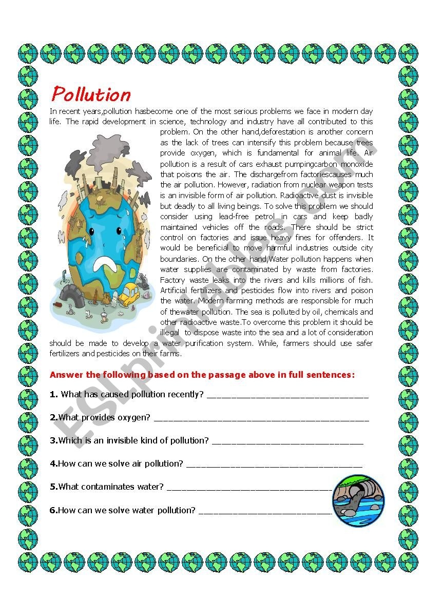 Pollution Reading Comprehension Worksheet