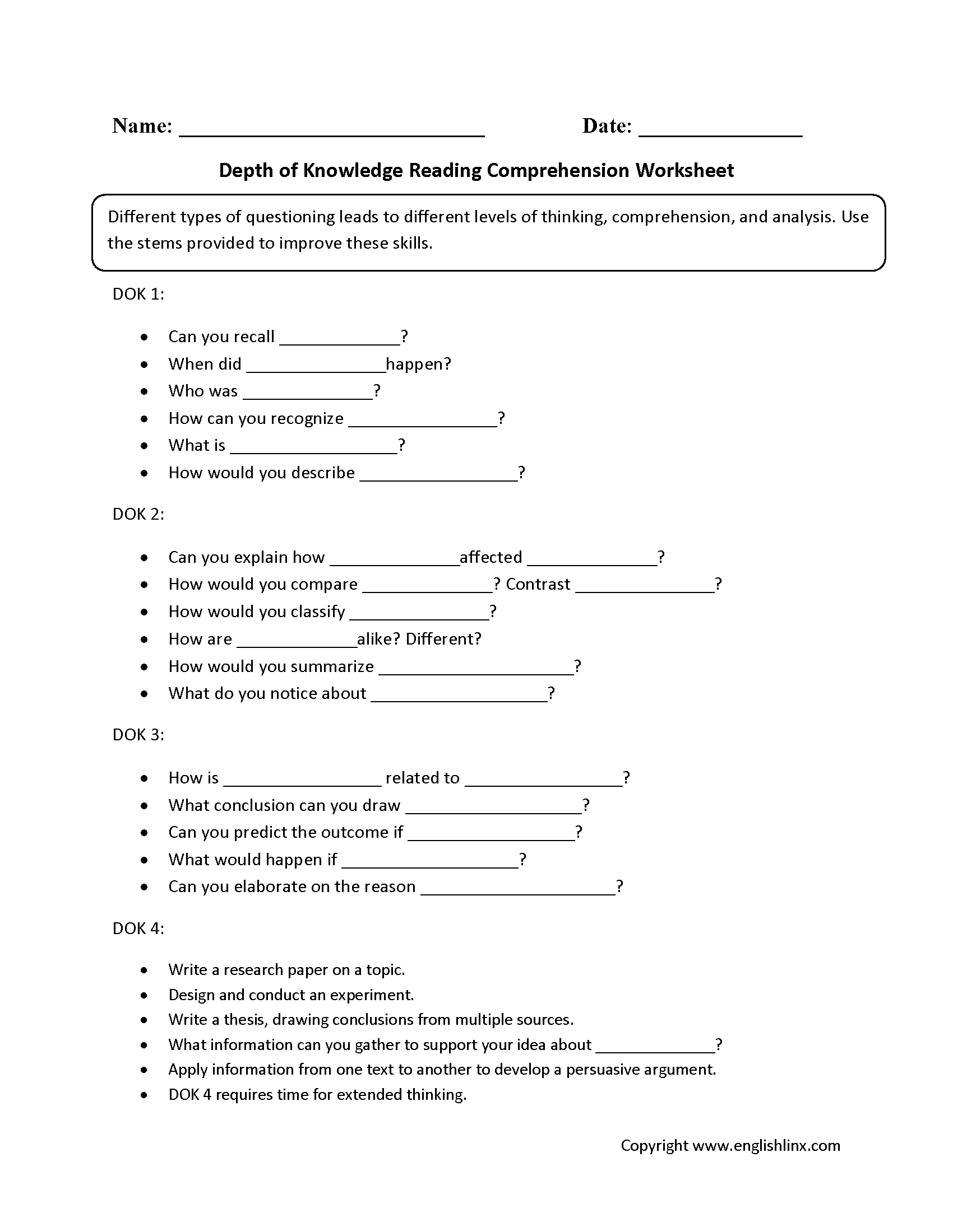 Reading Comprehension Worksheets Depth Of Knowledge Reading Comprehension Worksheets