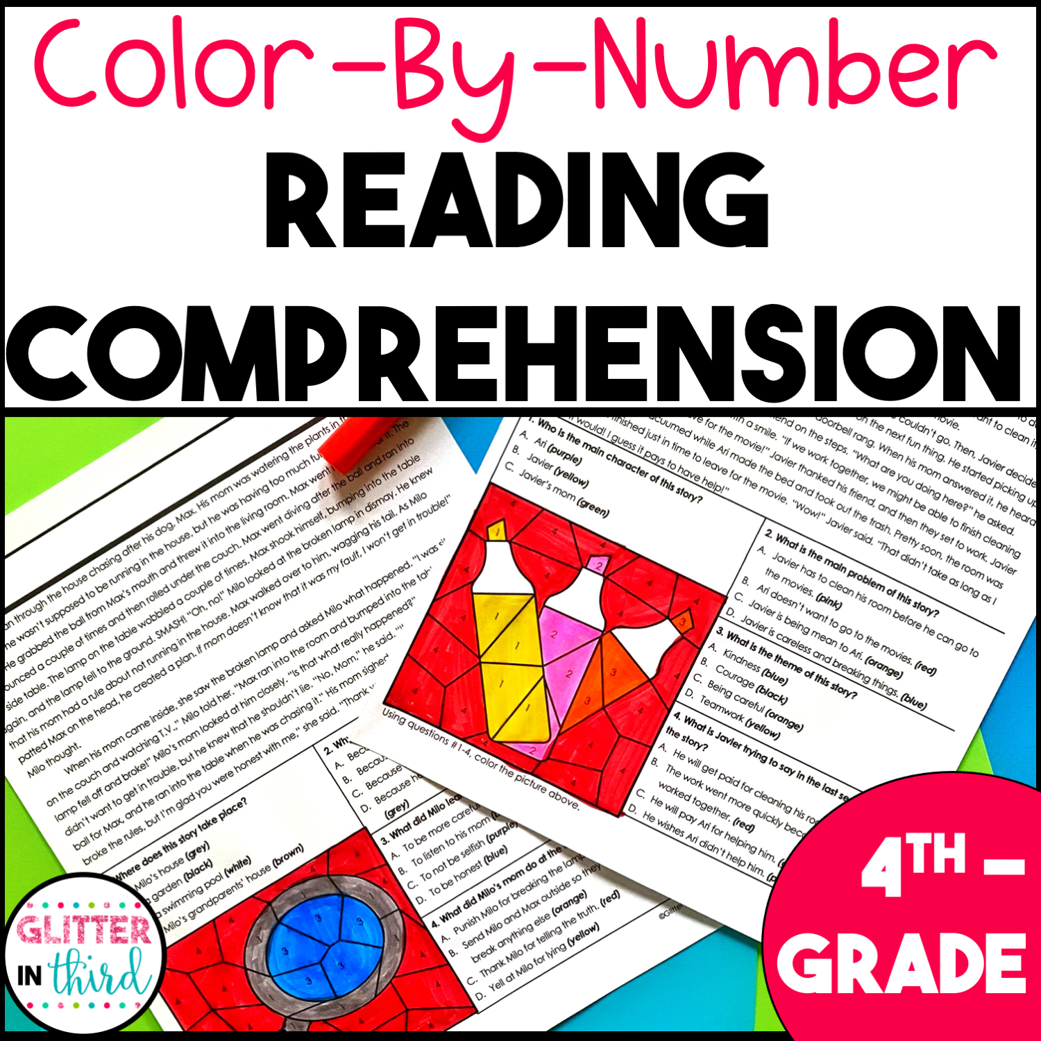 4th Grade Reading Comprehension Passages And Questions Color By Number Worksheets BUNDLE Glitter In Third