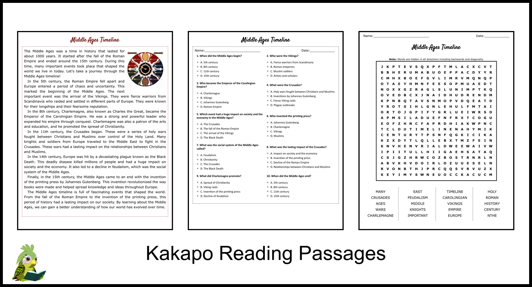 Middle Ages Timeline Reading Comprehension And Word Search