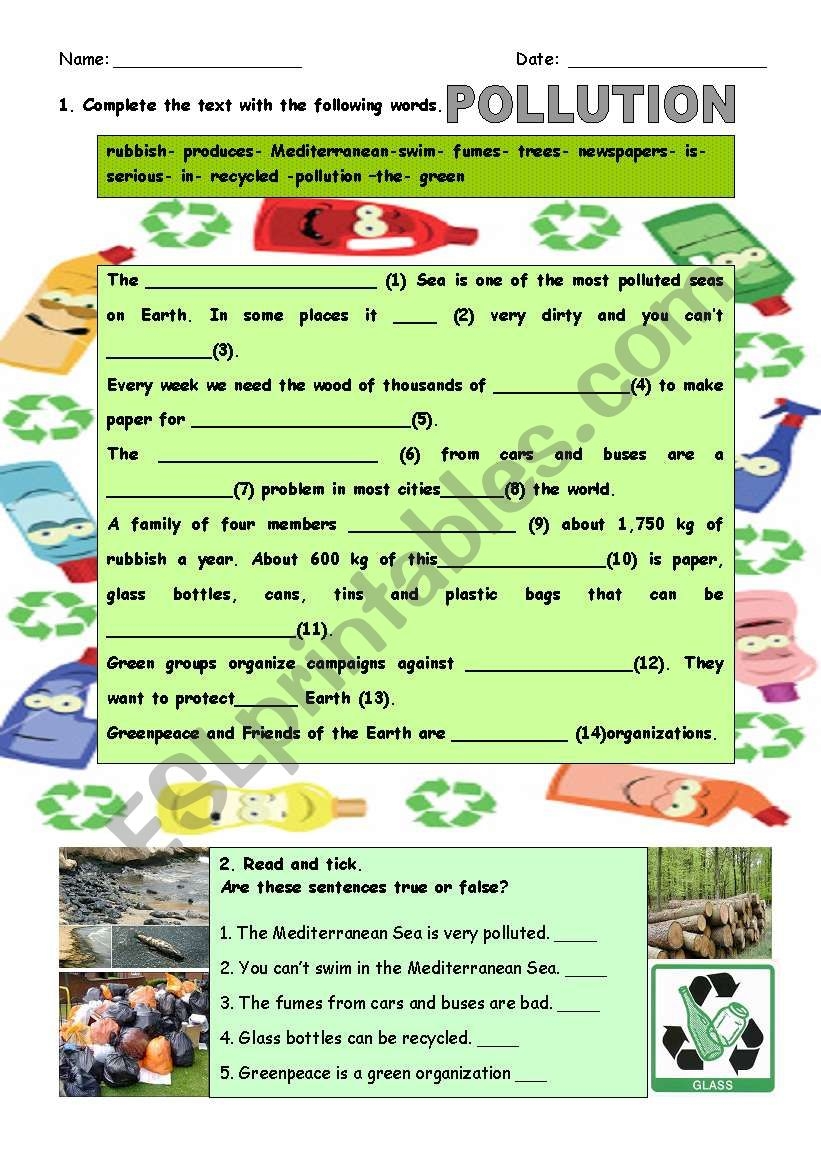 This worksheet is designed to help students understand the causes and effects of pollution in a simple and engaging way. By reading a short passage and answering questions, children can improve their reading comprehension skills while learning about the impact of pollution on our planet.