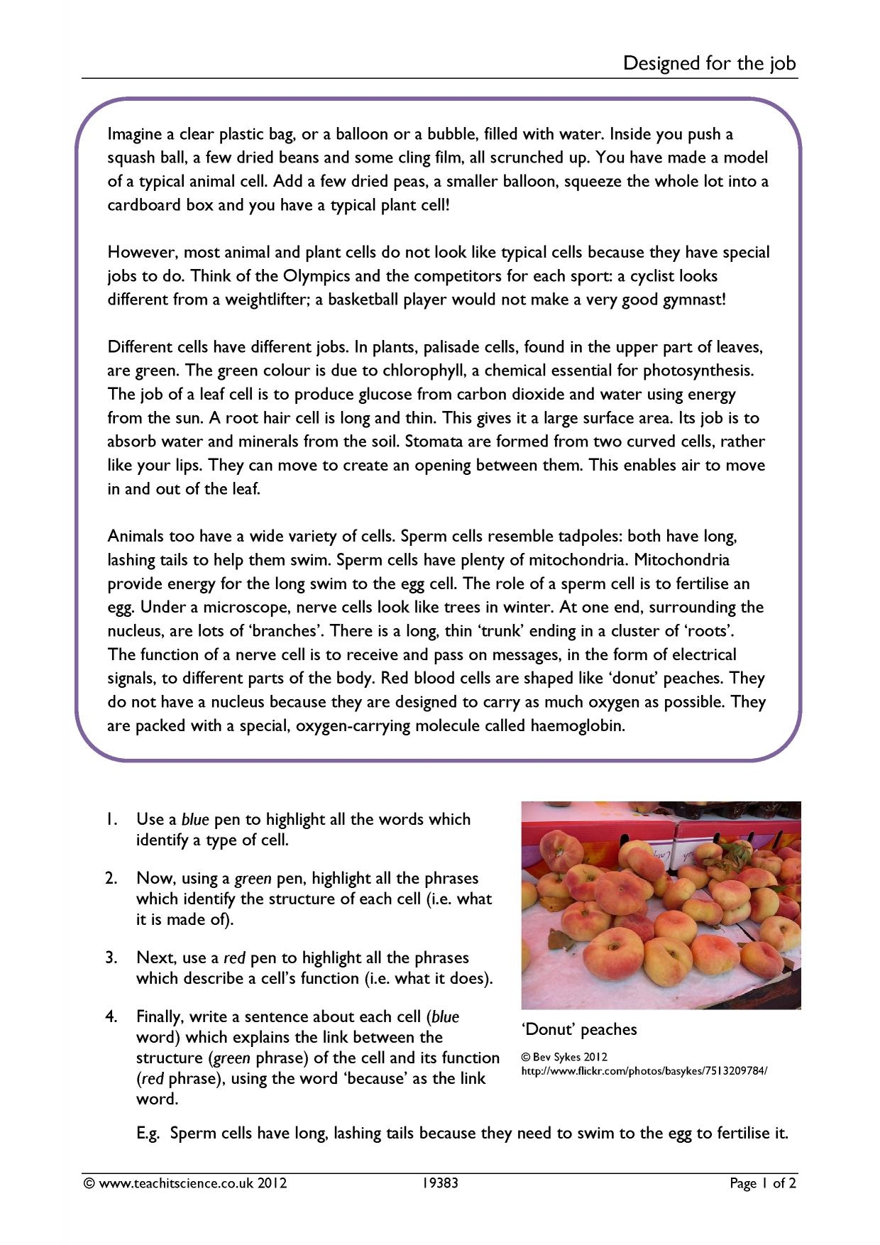 Reading Comprehension Worksheet Cells
