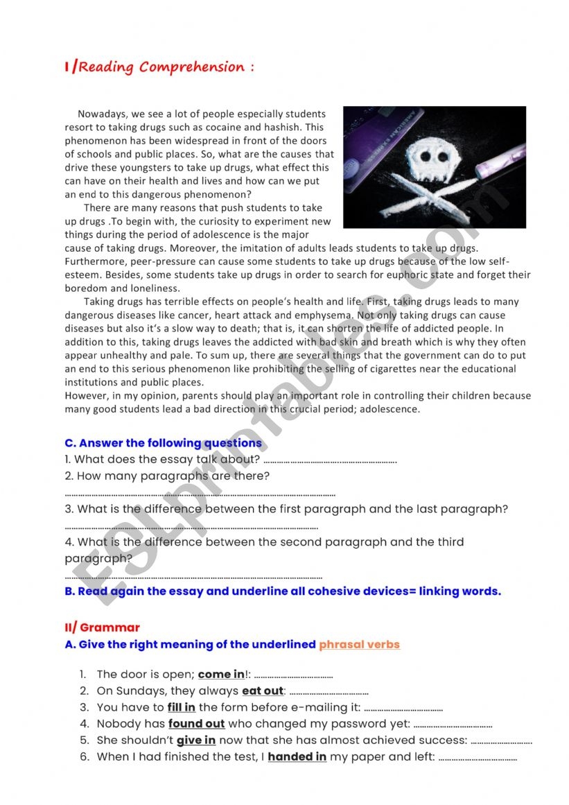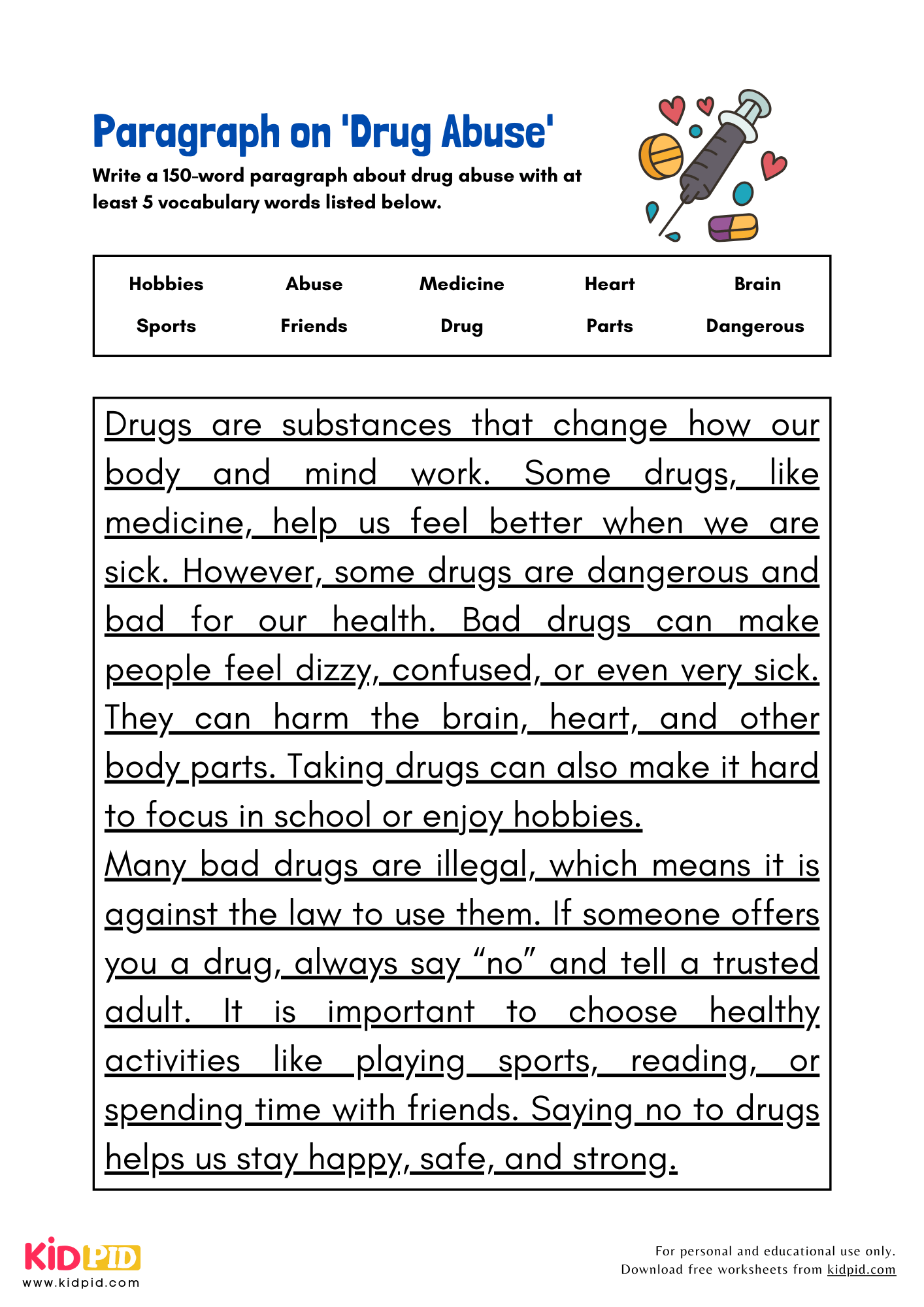 This worksheet is designed to help students develop their reading comprehension skills while learning important information about drugs and their effects. It covers topics such as the dangers of drug abuse, the impact of drugs on the body and mind, and ways to say no to drugs.