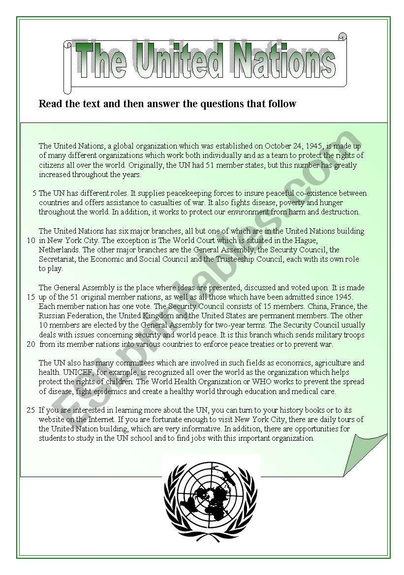 The United Nations Reading Comprehension ESL Worksheet By Pirchy