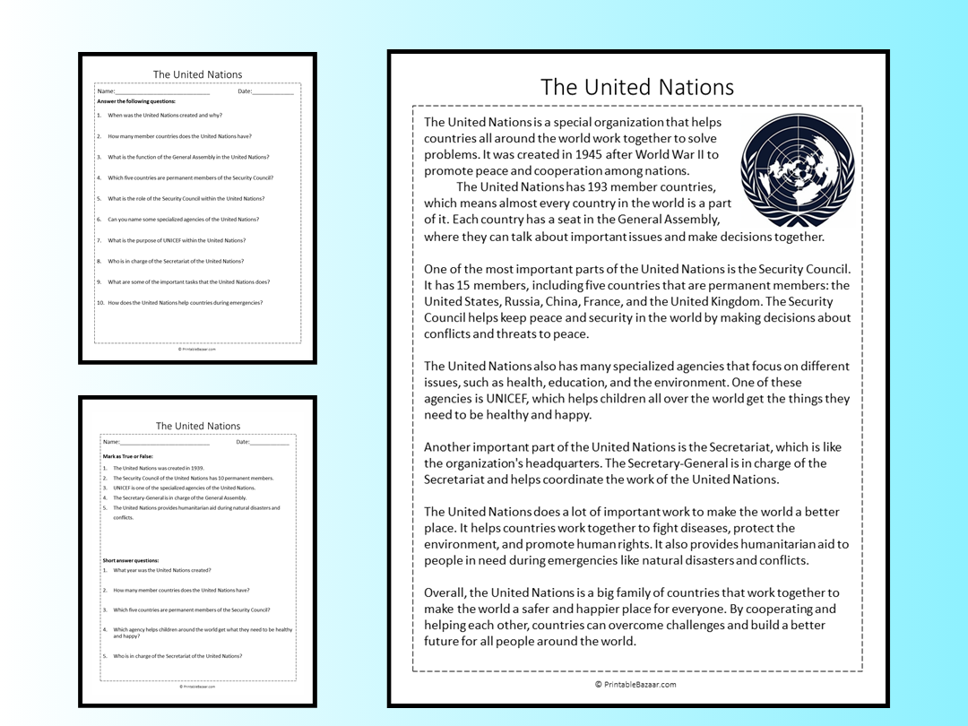 The United Nations Reading Comprehension Passage Printable Worksheet Teaching Resources