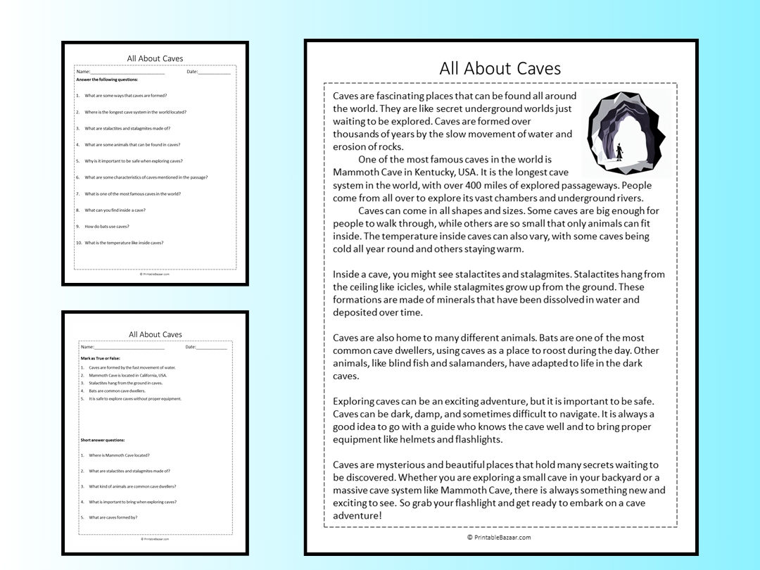 All About Caves Reading Comprehension Passage Printable Worksheet Teaching Resources