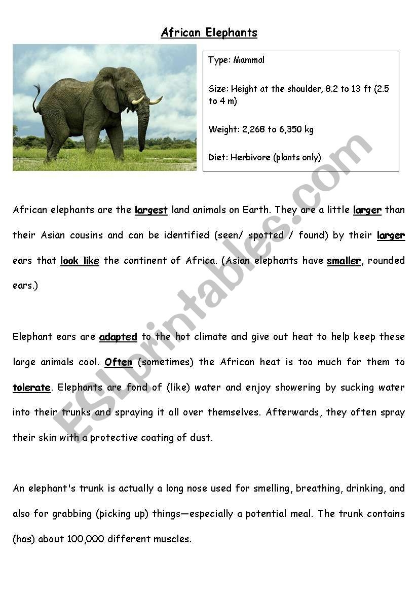 ELEPHANTS Reading Comprehension Varied Questions And Vocabulary