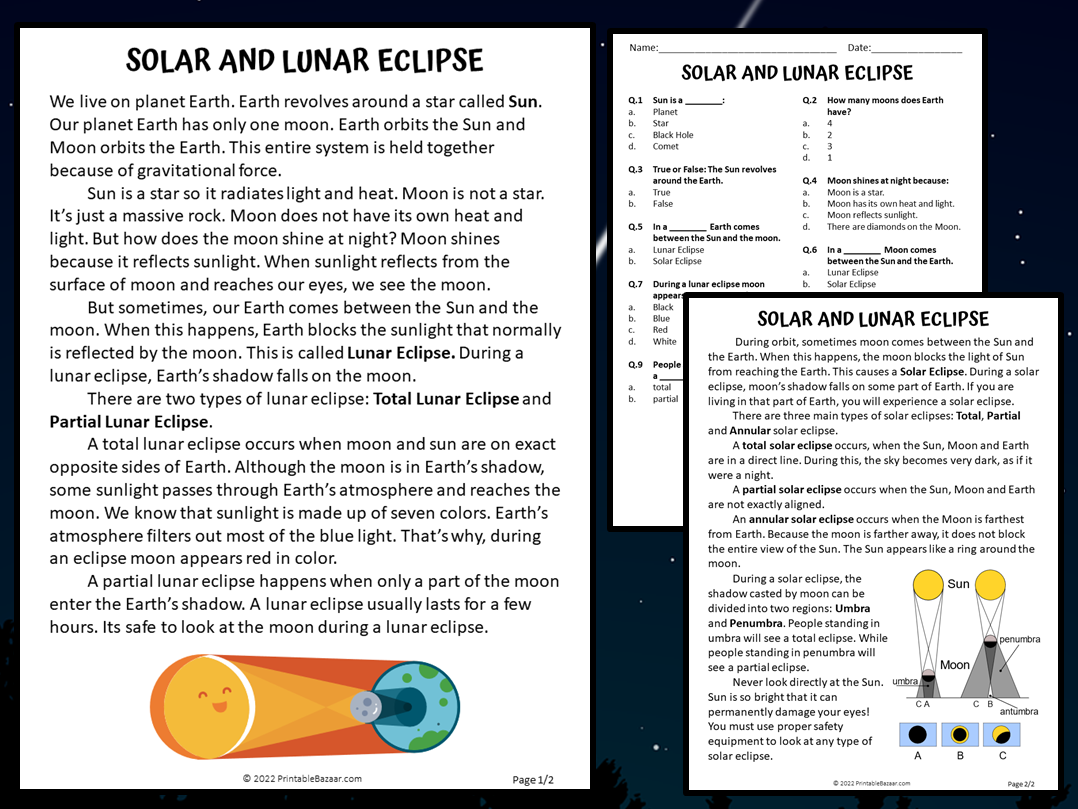 Lunar And Solar Eclipses Reading Comprehension And Questions Worksheets Classful