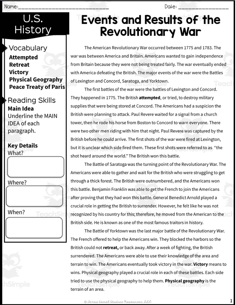 So, why wait? Incorporate Revolutionary War reading comprehension worksheets into your lesson plans today and watch as your students’ understanding and appreciation of history grows. These worksheets are sure to make learning about the Revolutionary War a memorable and enjoyable experience for all!