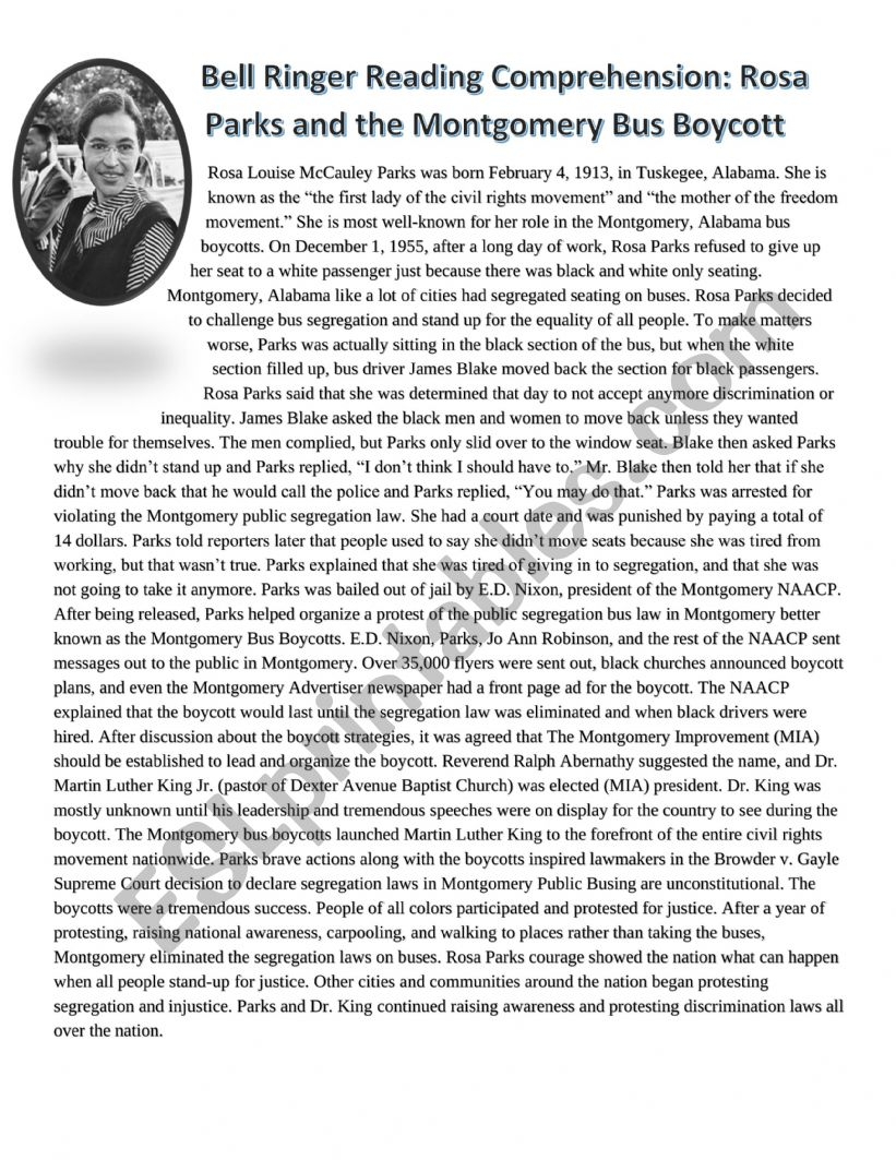 Furthermore, reading comprehension worksheets on Rosa Parks can be customized to suit different grade levels and learning styles. They can include vocabulary exercises, discussion questions, or even creative writing prompts to help students engage with the material in a meaningful way.