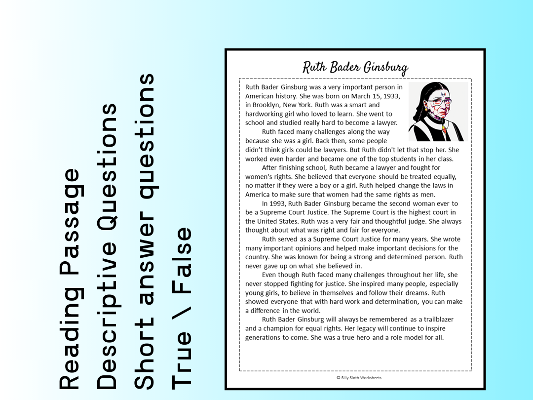 So why wait? Download our Ruth Bader Ginsburg reading comprehension worksheets today and start exploring the incredible life of this trailblazing woman with your students. Together, we can continue to honor her legacy and strive for a more just and equal world.