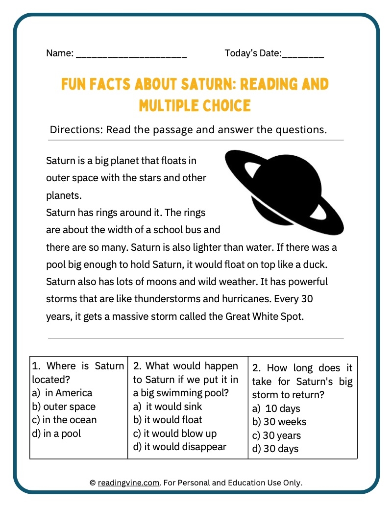 Designed for elementary and middle school students, a Saturn reading comprehension worksheet typically includes a passage about the planet, followed by a series of questions that test students’ understanding of the text. These questions may range from simple recall to more complex analysis and inference.