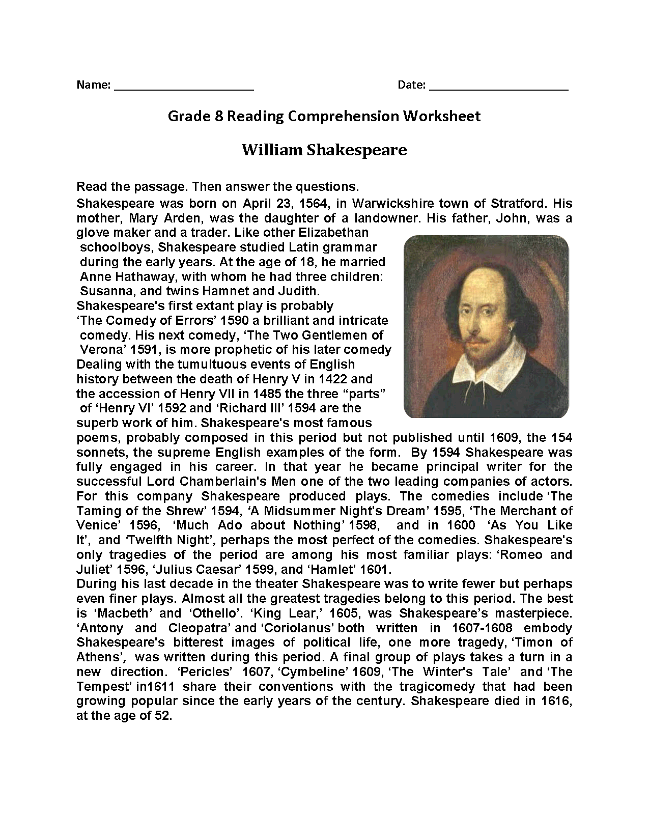 William Shakespeare Reading Comprehension Passage And Assessment Classful