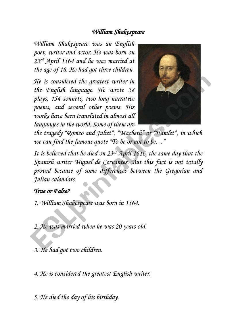 William Shakespeare Reading ESL Worksheet By Silvi85