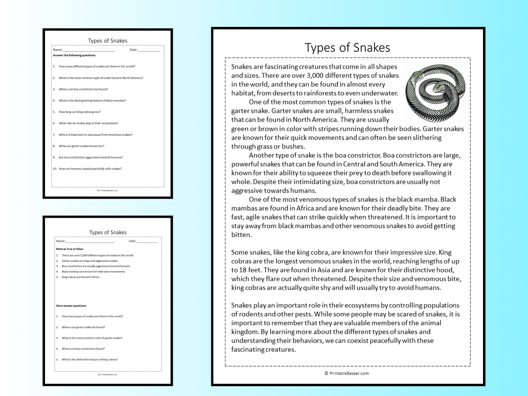 Encourage your students to dive into the world of snakes with our engaging reading comprehension worksheet. Watch as their reading skills improve and their knowledge of these fascinating creatures grows. Download our Snake Reading Comprehension Worksheet today and make learning fun!