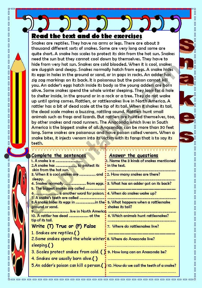 Snakes Comprehension ESL Worksheet By Alexiosthegreat