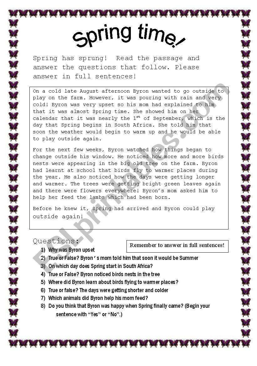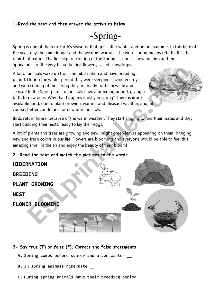 Designed for elementary school students, this worksheet includes a variety of short passages about spring-related topics like flowers, animals, and weather. Each passage is followed by comprehension questions to test students’ understanding of the text.