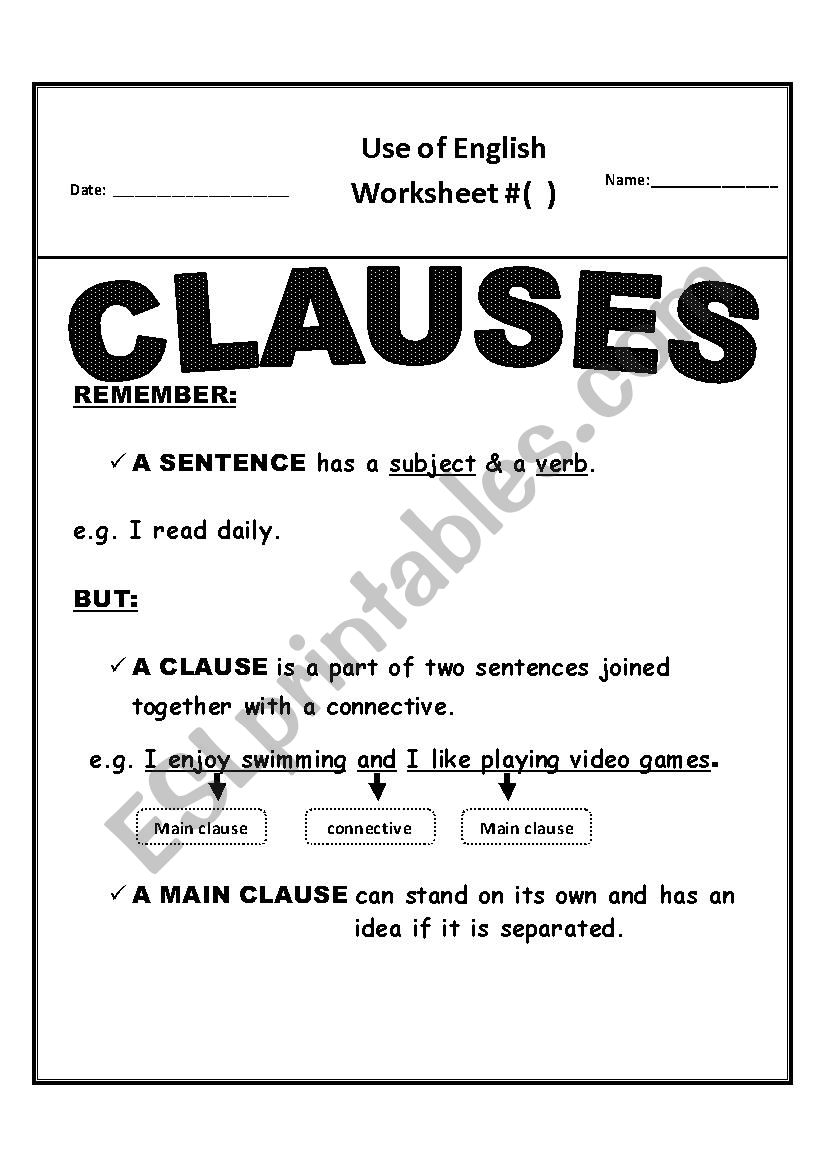 Clauses Worksheets Main And Subordinate Clauses Worksheet