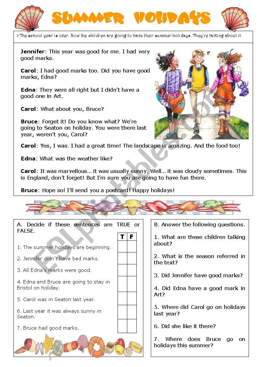 SUMMER HOLIDAYS READING AND COMPREHENSION ESL Worksheet By
