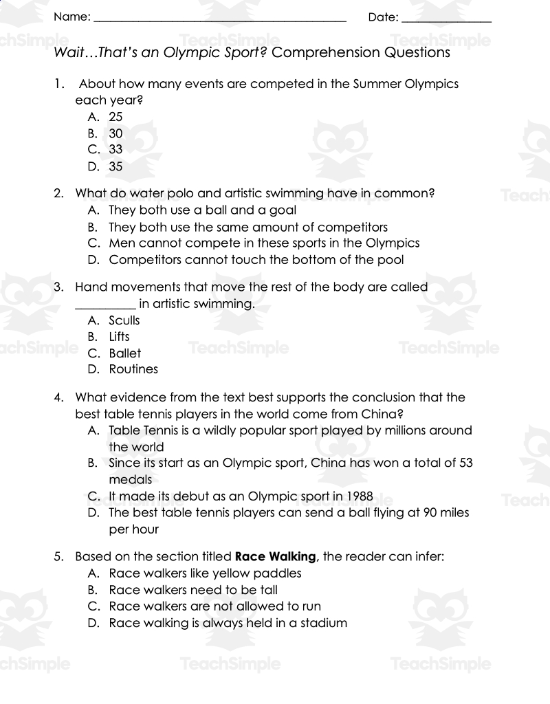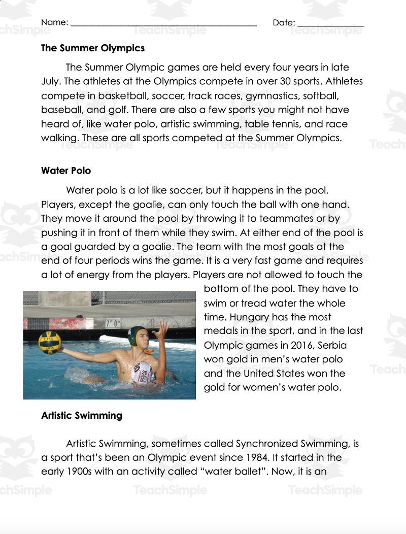 Summer Olympics Reading Passage And Questions 2nd 5th Grade Version By Teach Simple