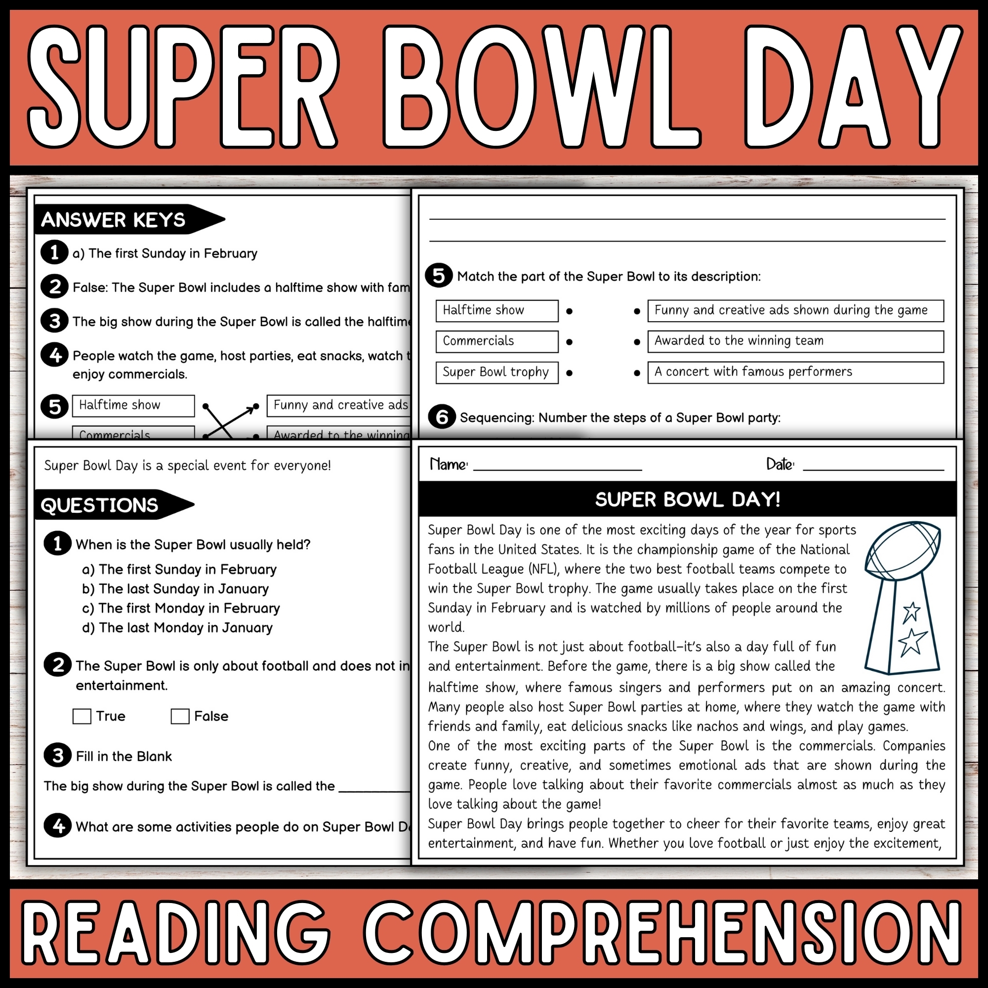 So, why not add a touch of Super Bowl excitement to your reading lessons? With Super Bowl reading comprehension worksheets, you can make learning fun and engaging for your students while tapping into their love for sports. Get ready to score a touchdown in reading comprehension!