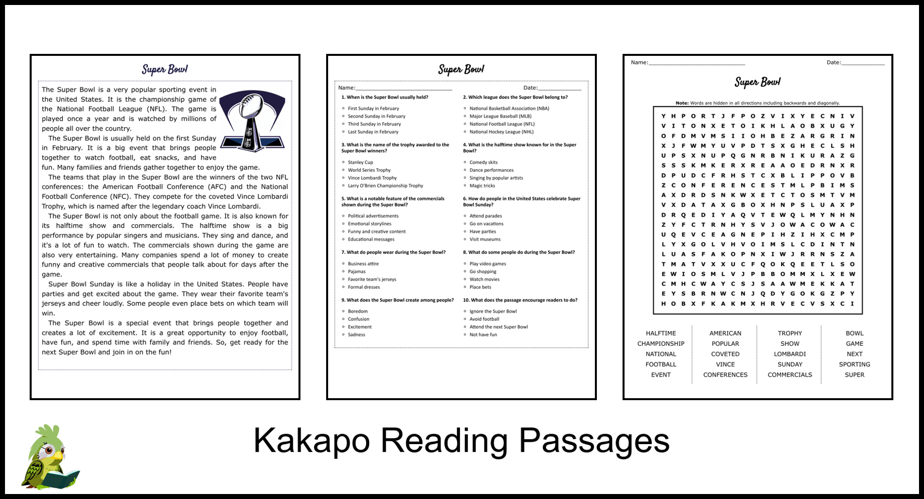 With a variety of topics to choose from, including Super Bowl history, famous players, and fun facts, these worksheets cater to different interests and reading levels. Students can practice reading, vocabulary, and critical thinking skills while having fun!