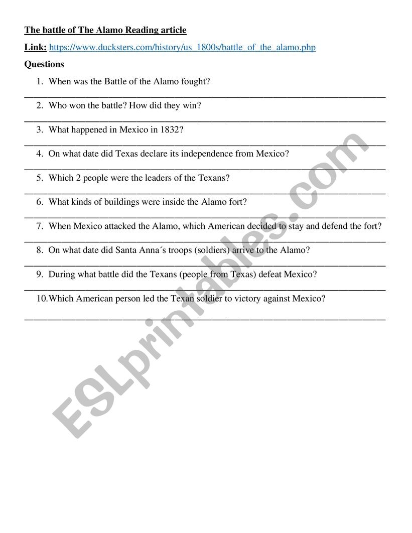 The Battle Of The Alamo Reading Article ESL Worksheet By Borotraj