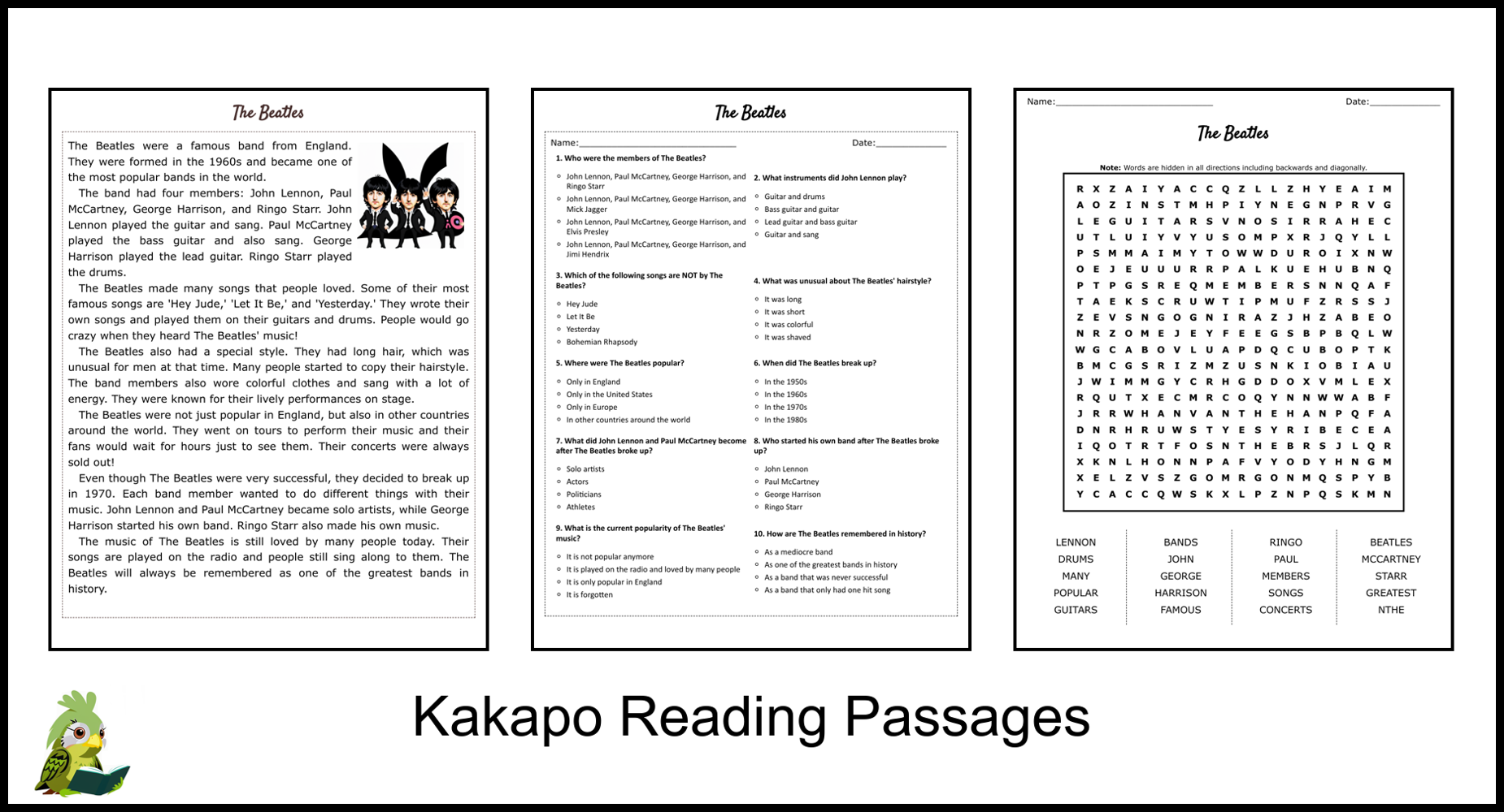 The Beatles Reading Comprehension And Word Search Teaching Resources