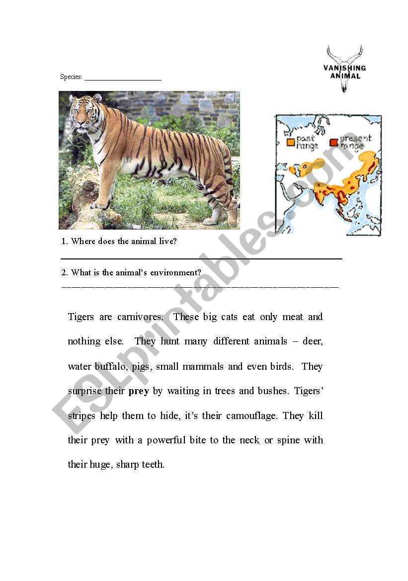 Tigers a Comprehension Passage ESL Worksheet By Adel A