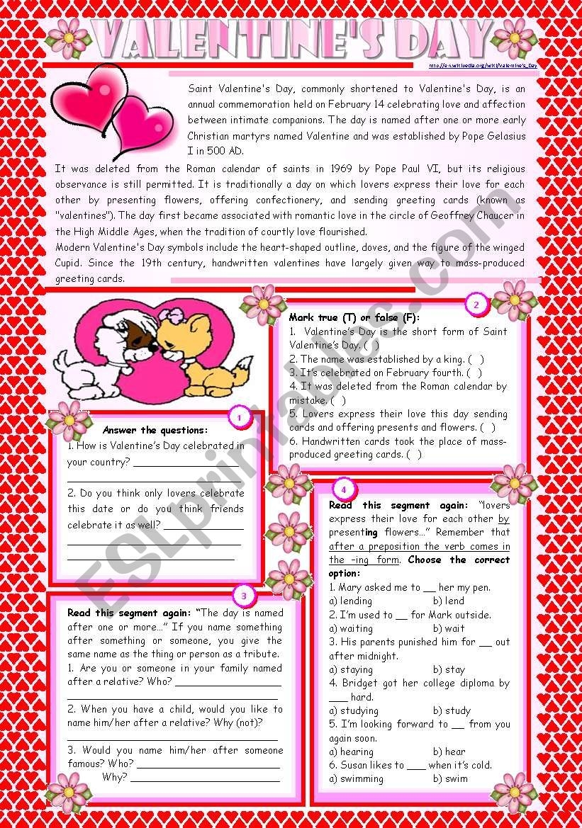 Valentine s Day Reading Comprehension Worksheet Games4esl