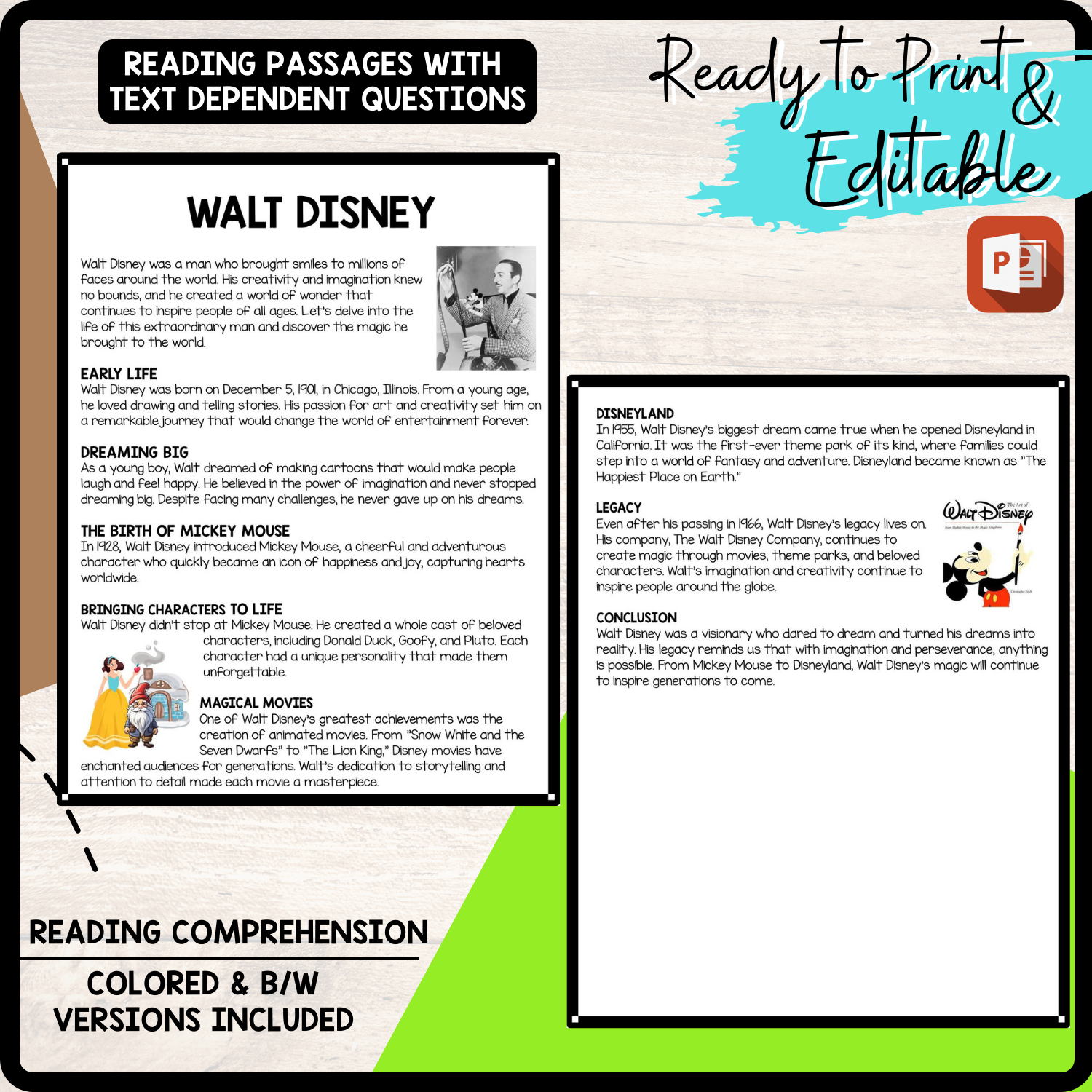 Walt Disney Biography Reading Comprehension Passage Printable Worksheet PDF Teaching Resources
