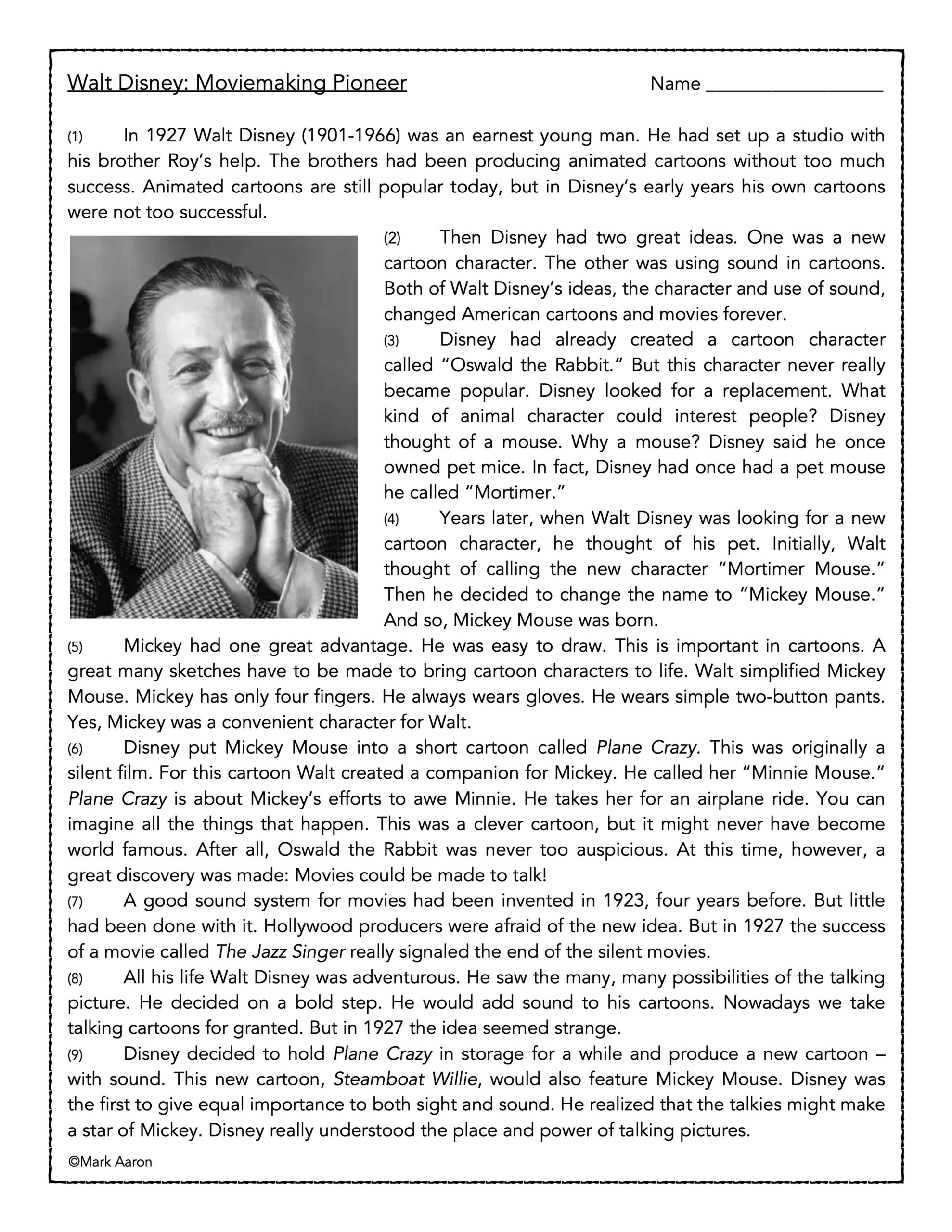 Walt Disney Moviemaking Pioneer Reading Comprehension Passage And Assessment Classful