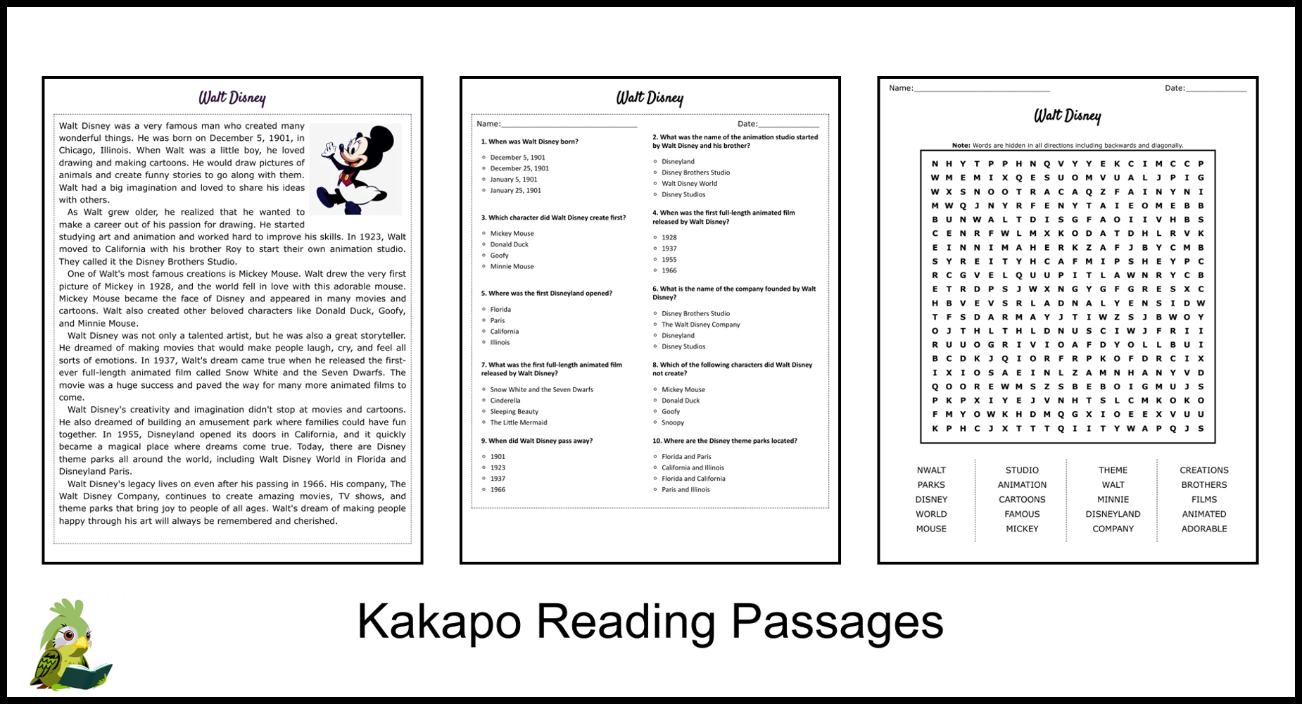 The passage included in this worksheet will provide you with interesting facts about Walt Disney’s life, his creations, and his impact on the entertainment industry. You’ll be able to test your comprehension by answering questions that will challenge your understanding of the text.