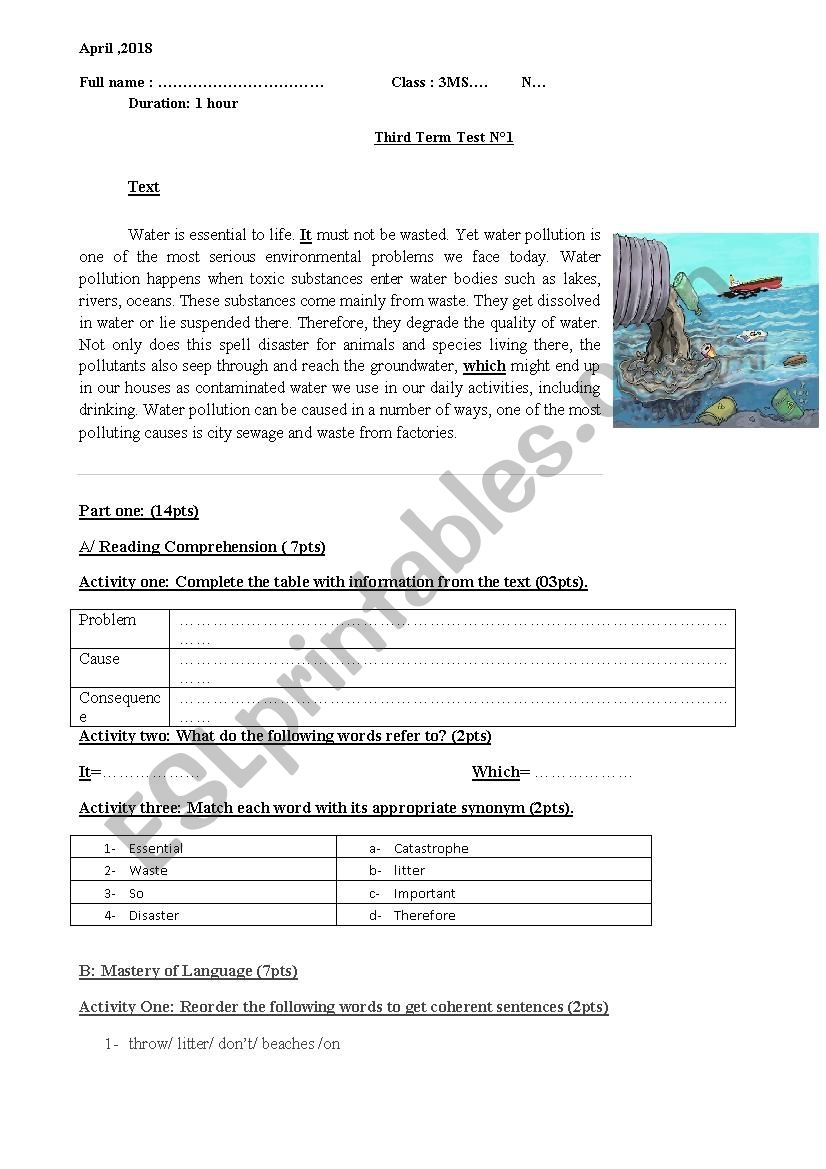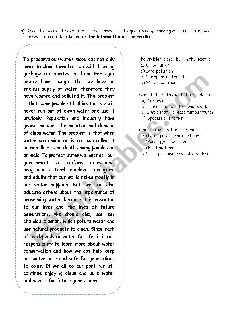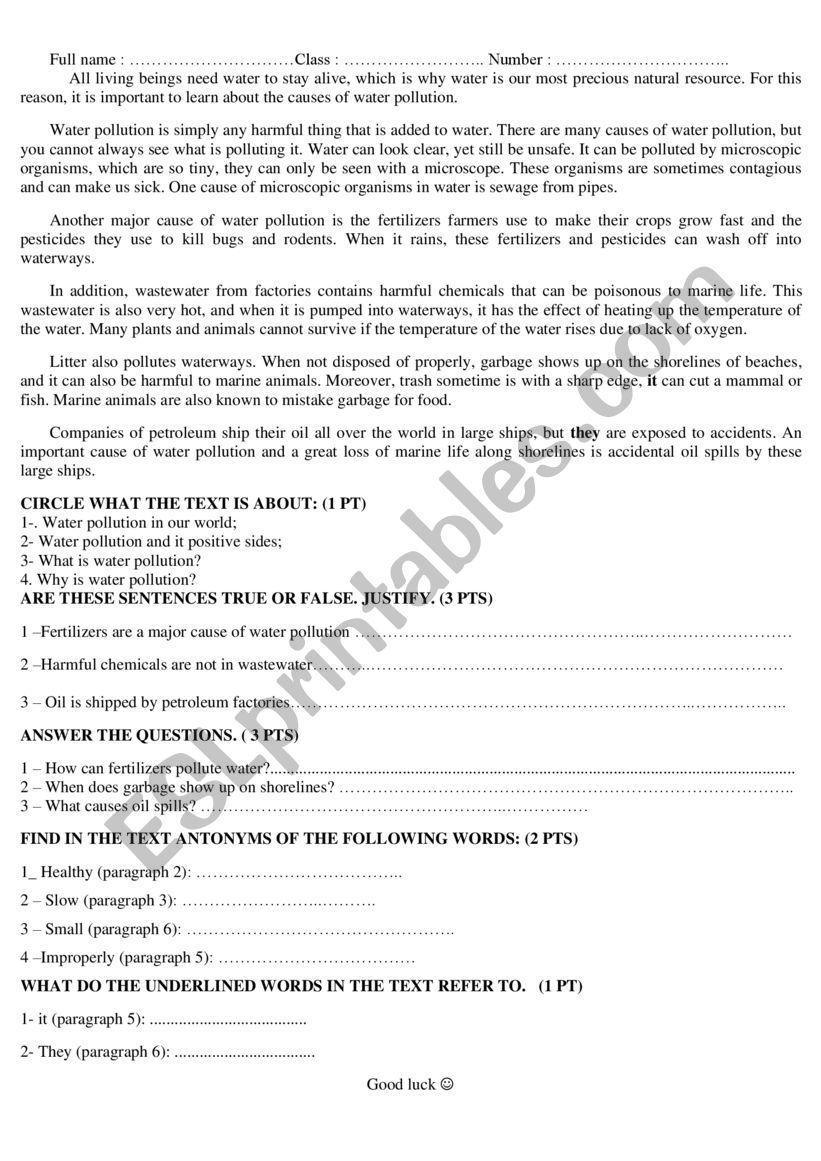 Reading Comprehension Quizz On Water Pollution ESL Worksheet By